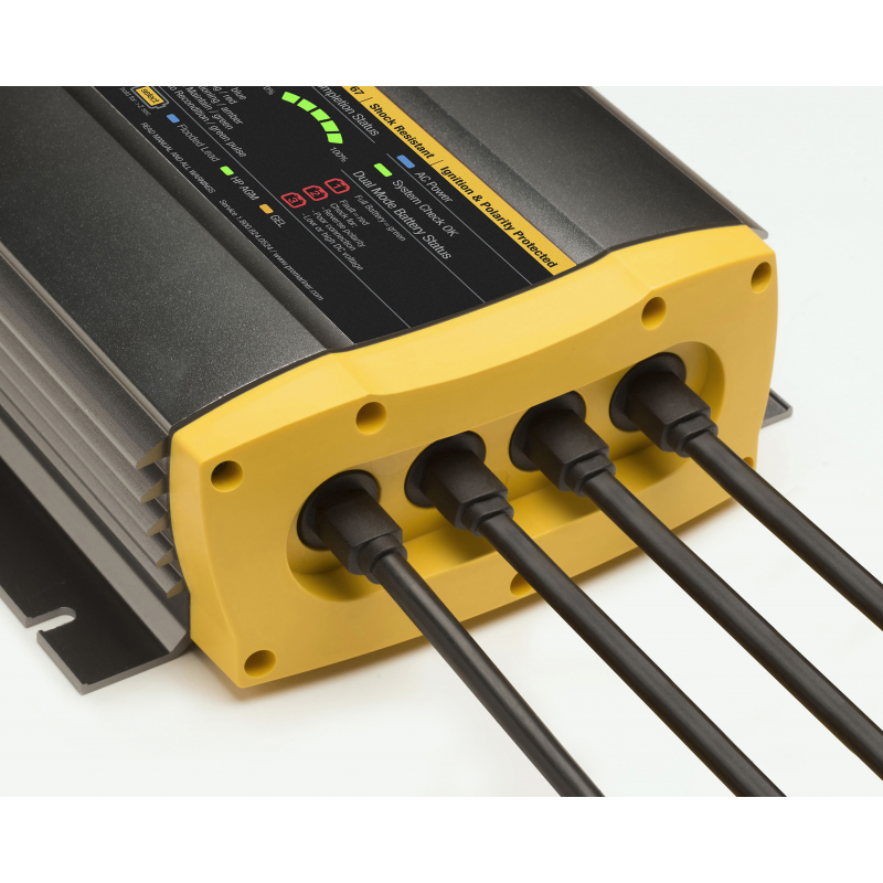 ProSport HD per batterie al litio vanta un nuovo dissipatore di calore a tre superfici. Questo design leggero garantisce una ricarica più rapida, grazie a un raffreddamento ottimale, e fornisce allo stesso tempo una corrente nominale costante in ampere durante la carica. Profili di carica selezionabili dall’utente per le batterie Flooded, AGM, Gel e batterie ProMariner LiFePO4 approvate (litio). Il microprocessore potenziato e il software di controllo di ProSportHD presentano un cruscotto di nuove funzioni digitali, tra cui: indicatore di carica completa, barra LED della modalità di carica, indicatori individuali di batteria piena/guasta a doppia modalità e 4 profili di carica ad alte prestazioni selezionabili digitalmente. La ricarica multistadio completamente automatica migliora le prestazioni della batteria con 5 fasi sequenziali: Analisi, Ricarica, Condizionamento, Mantenimento automatico (risparmio energetico) e una modalità di ricondizionamento una volta al mese, sicura per lo stoccaggio a breve e lungo termine. Il sistema Distributed-On-Demand assicura il 100% dell’amperaggio di carica disponibile sia utilizzato completamente per soddisfare la domanda di ogni batteria a bordo. Gli indicatori System Check OK e Battery Status forniscono un feedback in tempo reale sullo stato dell’installazione e della batteria. Progettato per l’uso in ambienti gravosi, con cavi di alimentazione CC e CA rivestiti di tipo industriale e dotati di scaricatori di tensione stampati e sdoppiatori di fili. Caratteristiche di sicurezza, tra cui doppi fusibili impermeabili in linea, inversione di polarità, sovratemperatura e sovracorrente, sovratensione e protezione dall’accensione.