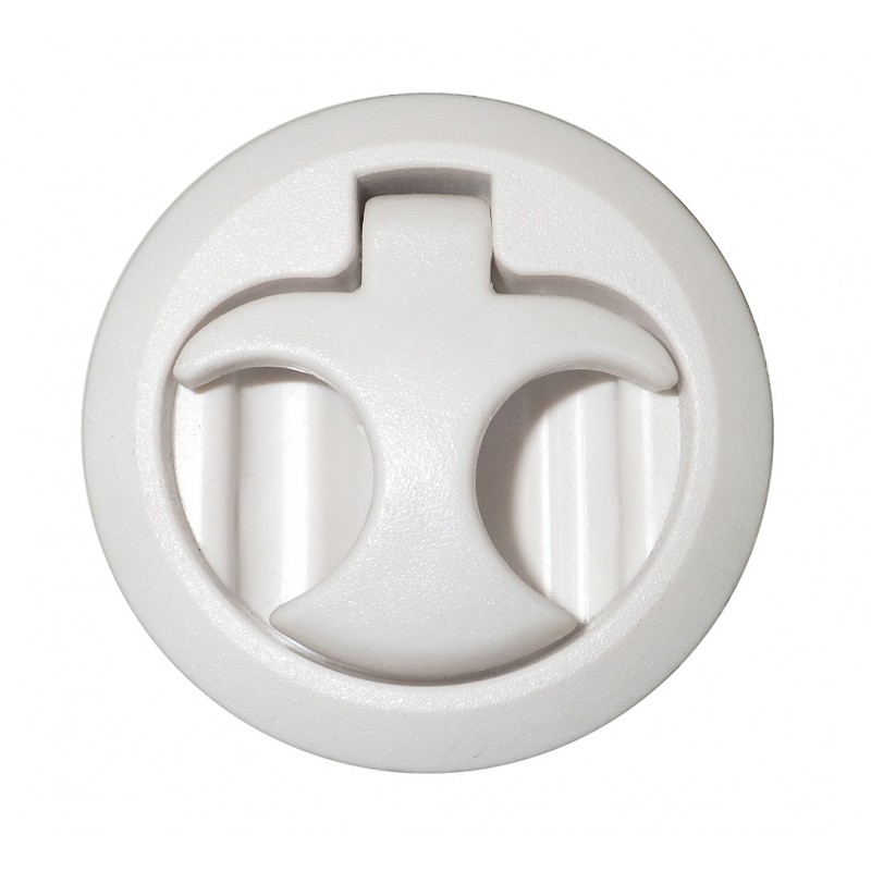 Alzapagliolo in nylon bianco, con maniglia a molla e fermo a scatto. Completo di squadretta di battuta in acciaio inox, anelli in gomma di spessore mm. 3/6/9, foro ø mm. 50, utilizzabile per spessori da mm. 11 a mm. 15.