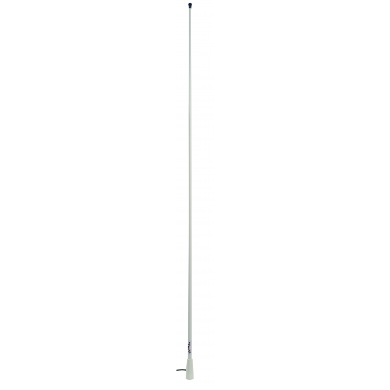 Antenna VHF in fibra di vetro, ideale per gommoni e barche a motore. Freq. 156-162 Mhz, guadagno 3 db, impedenza 50 ohms, SWR = 1,3 a 156,8 MHz, max input power 100 W. Cavo coassiale (non tagliabile) da 4,5 mt, con connettore Pl259.