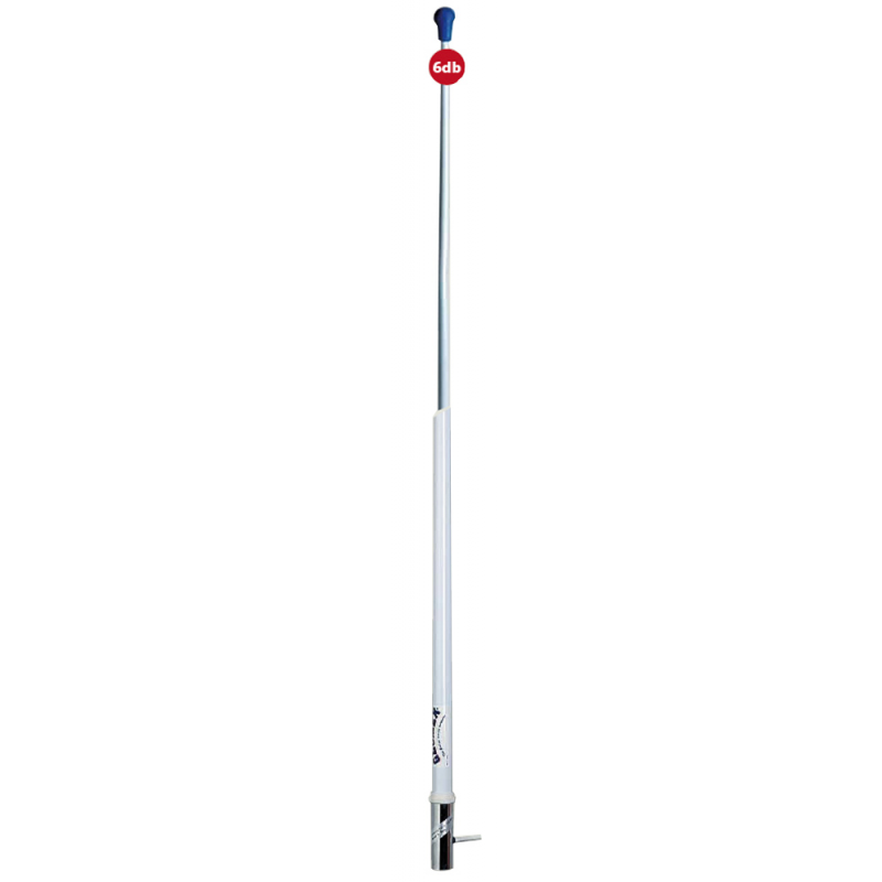 Antenna VHF in fibra di vetro, con connettore pl259. Frequenze Vhf da 156 a 162 mhz, compatibili con i segnali AIs. Guadagno 6 db, cavo coassiale (non tagliabile) da 4,5 mt con boccola cromata.