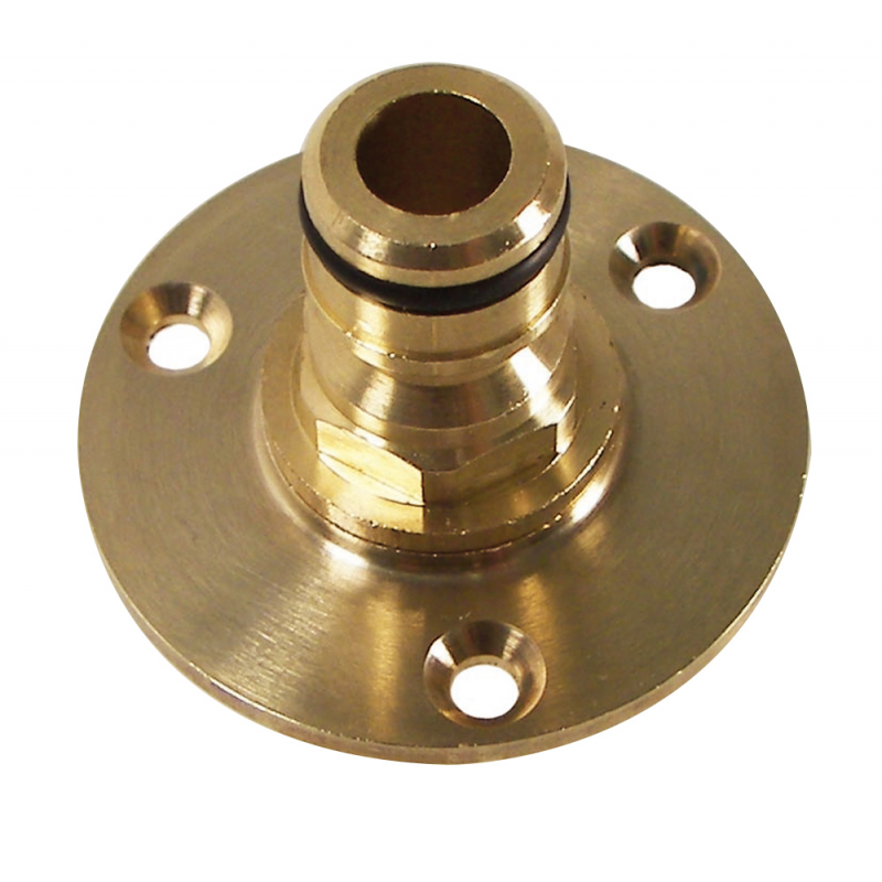 Raccordo maschio da 1/2’, compatibile con tutti i sistemi rapidi in commercio in ottone e plastica, completo di rondella ø mm. 50 con tre fori di fissaggio. Ideale per creare punti di collegamento alle manichette per il lavaggio ponte ecc..