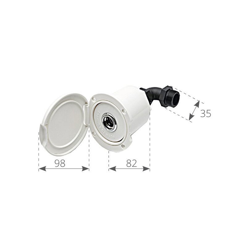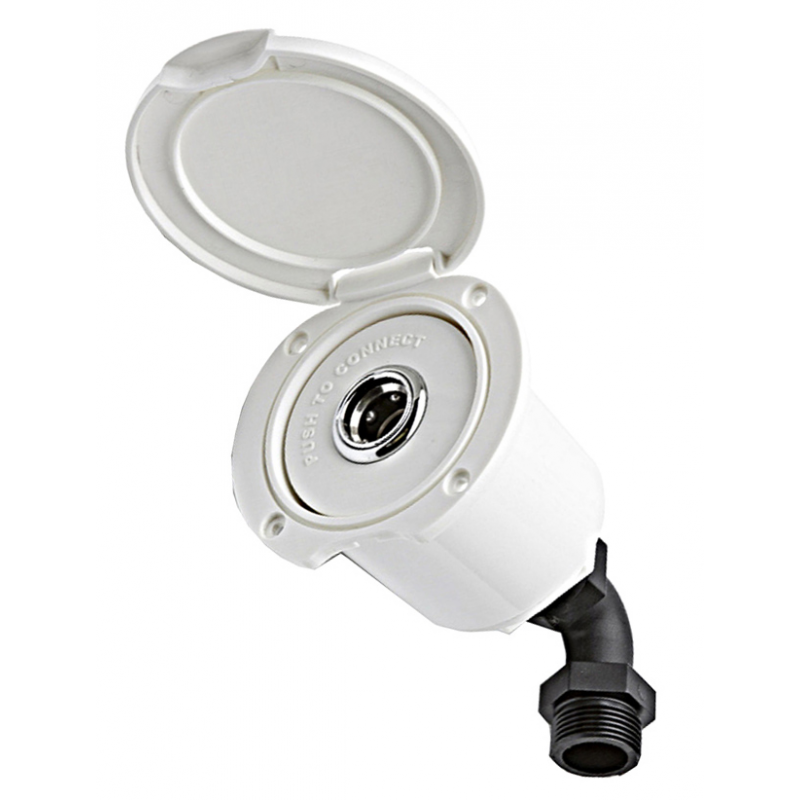 Attacco rapido femmina presa di coperta per acqua di mare (o dolce) da utilizzare a bordo per il lavaggio coperta o servizi. Completo di contenitore in ABS bianco e valvola di non ritorno, attacco a gomito filetto maschio da 3/4”. Coperchio bianco.