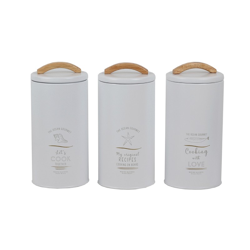 Set barattoli da cucina in acciaio smaltato bianco con manico in legno e coperchio ermetico.Perfetti per conservare caffè, zucchero e tè. Set 3 pz.