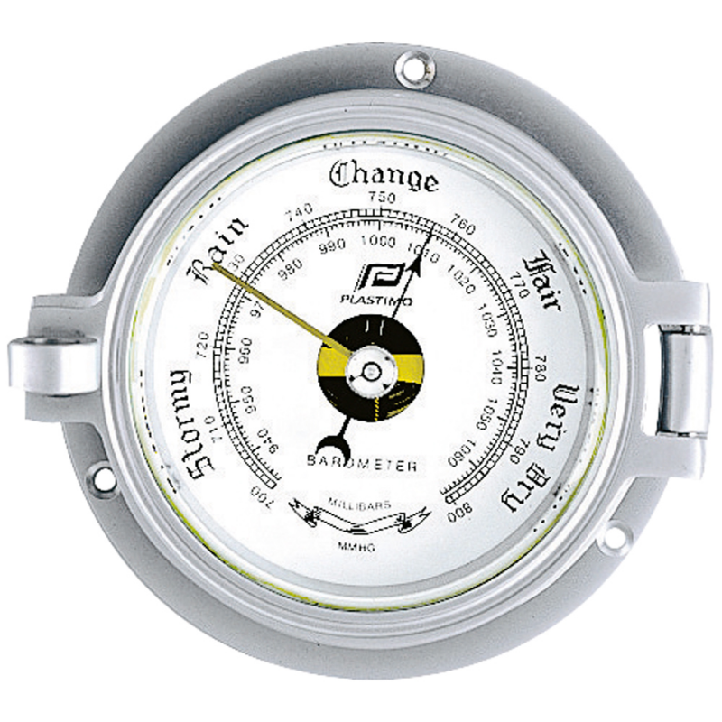 Barometro in alluminio cromato opaco con meccanica di precisione a movimento aneroide ad alta sensibilità con catena metallica integrata, vetro minerale smussato.