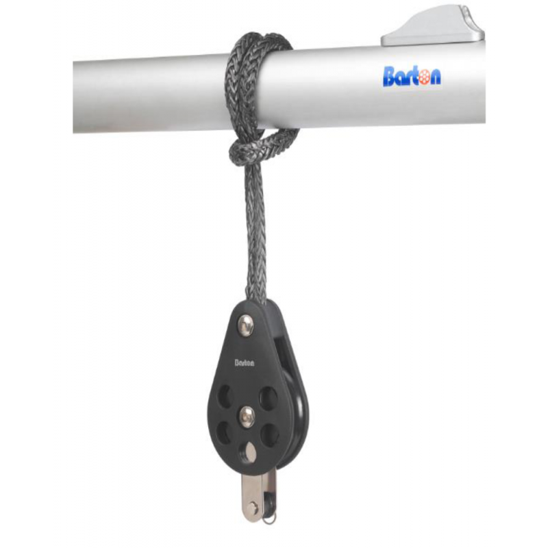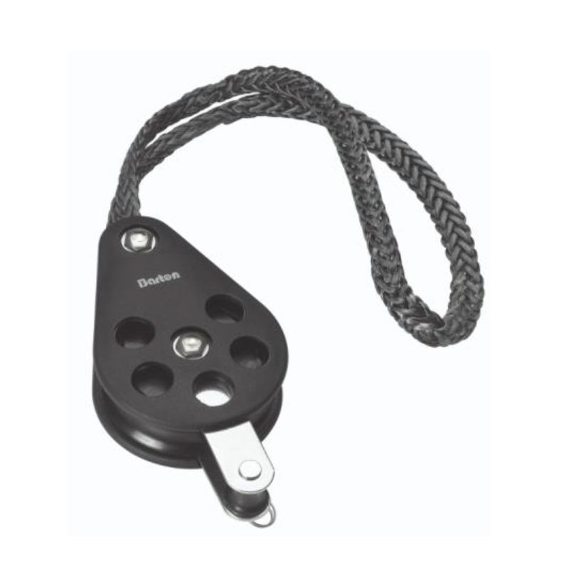 Bozzello in nylon nero caricato a vetro e acciaio inossidabile, puleggia con cuscinetto e arricavo in acciaio inox. L’anello in Dyneema permette di fissare il bozzello con semplicità su ogni tipo di supporto per creare un dispositivo di sollevamento su misura.
