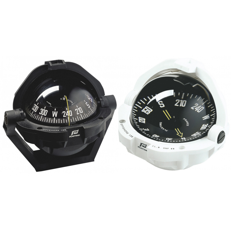 Bussola Offshore 135. Rosa con graduazione ogni 5°, illuminazione di serie a 12-24 V LED. Calotta di protezione retrattile in tre parti scorrevoli. Installazione ad incasso orizzontale o su staffa con l’apposito kit.