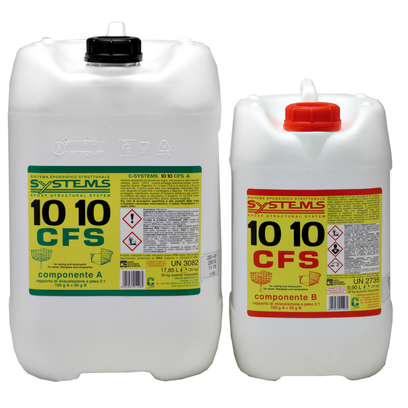 C-SYSTEM 10 10 CFS è una resina epossidica, multifunzionale, ideale per riparare, costruire, incollare, laminare, proteggere, stuccare, su legno e vetroresina. Non contiene solventi (CFS Completely Free Solvent). Sottoposto a test meccanici presso i laboratori del CTS Centro Tecnologico Sperimentale presenziati da RINA e altri registri navali. Ha uno standard qualitativo eccezionale e grazie alla sua fluidità, sfrutta una serie di additivi, che la rendono utilizzabile in ogni tipo di lavorazione per risolvere ogni esigenza, da lavorare sia a pennello che a rullo: collante legno-legno, legno-vetroresina, vetroresina-vetroresina e materiali eterogenei - per laminare tessuti di vetro, carbonio, kevlar su legno e su vetroresina ecc..- stucco strutturale (Structural Filler), aggiungendo gli additivi come Microfiller Powder, Addensante n° 2 o Microfibre Naturali e Minerali - stucco di riempimento e a rasare - mano di fondo per legno verniciato in trasparente e non verniciato - fondo antiosmosi - riparazione osmosi RESA: Per incollaggi il quantitativo varia da 300-500 g/mq in relazione alla rugosità della superficie. Per mano di fondo e impregnante da 12-15 mq/kg. NB - Su richiesta le confezioni di 10 10 CFS da 4,5 kg. e 30 kg. sono disponibili oltre che con catalizzatore STANDARD anche con catalizzatore FAST e catalizzatore SLOW (indicato nel periodo Primavera – Estate e comunque con temperature mai al di sotto dei 15°C.)