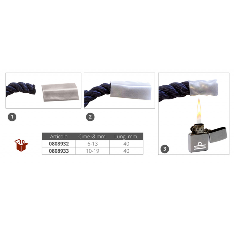 Capocorda termorestringente in PVC bianco morbido. Per rifinire in modo rapido e sicuro cime e trecce.
