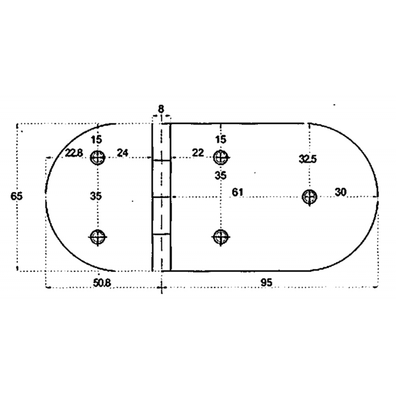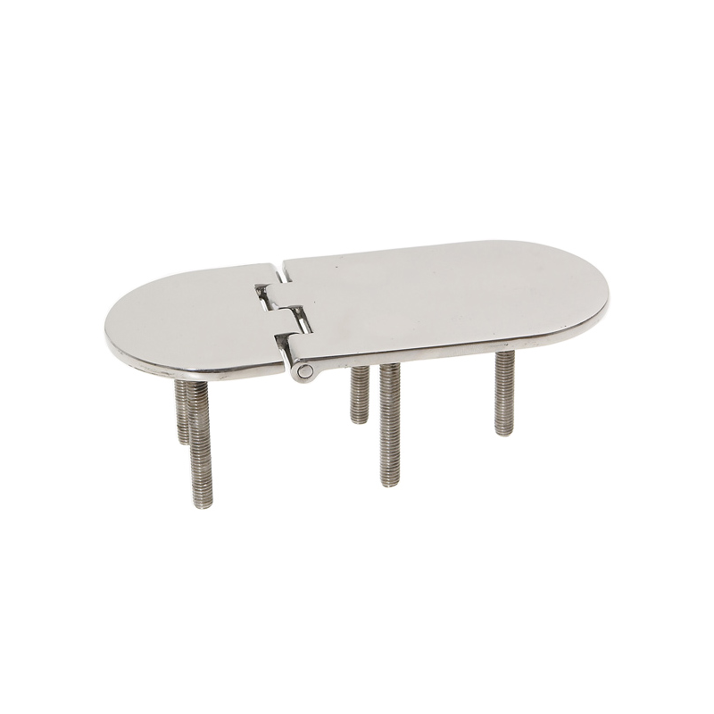 Cerniera lucidata a specchio in acciaio inox AISI 316. Spessore mm. 4, nodo rovesciato, apertura 95°, fissaggio con prigionieri lunghi mm. 45.