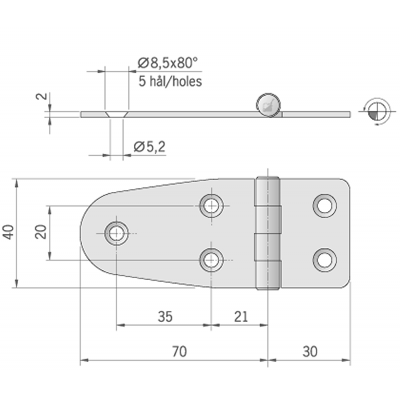 Cerniera lucidata a specchio in acciaio inox AISI 316. Spessore mm. 2, perno ø mm. 9 intestato