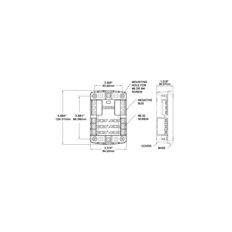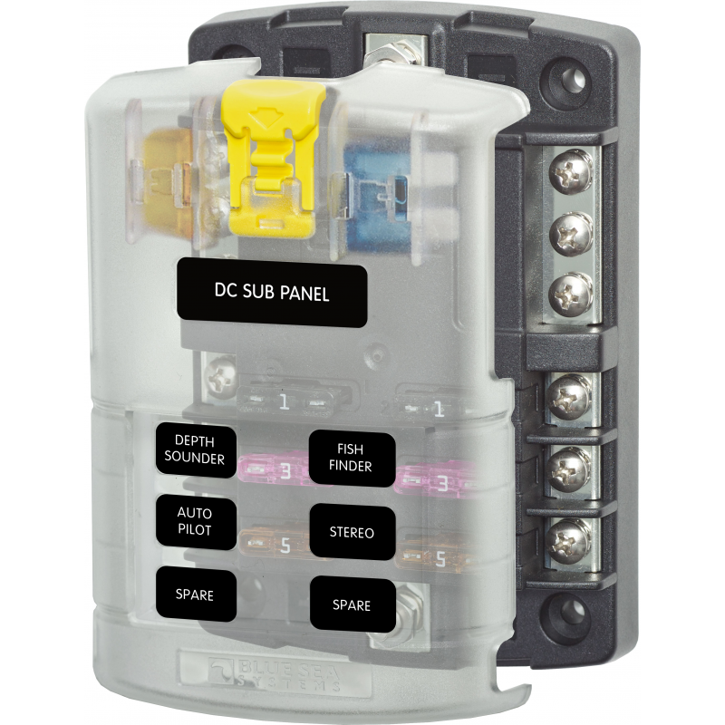 Pannello porta fusibili ST Blade in policarbonato rinforzato, per fusibili ATO/ATC. Barre e contatti in rame argentato. Barra di distribuzione polo negativo inclusa. Copertura isolata. Rif. originale 5026