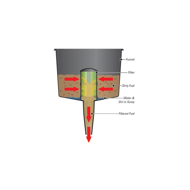 Imbuto con filtro integrato progettato per filtrare acqua, sporco e detriti dalla maggior parte dei combustibili (inclusi benzina, diesel, olio da riscaldamento e cherosene). Il modello è conduttivo e può essere collegato a terra.