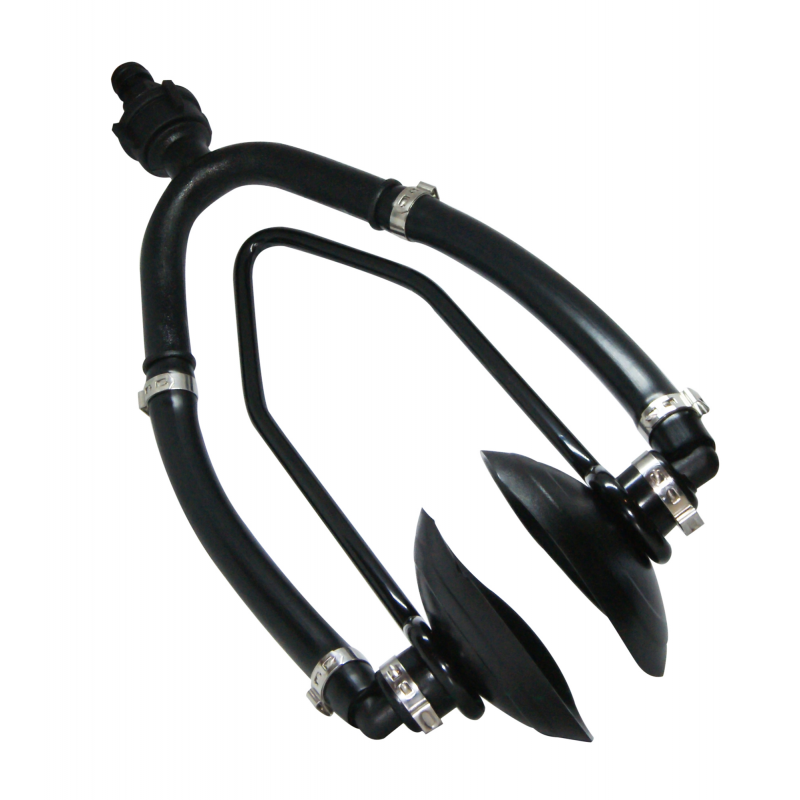 Cuffia lavaggio motori fuoribordo e gruppi poppieri con afflusso di acqua da entrambi i lati con attacco rapido tipo giardinaggio. Forcella in acciaioplastificato con ventose tonde in gomma.