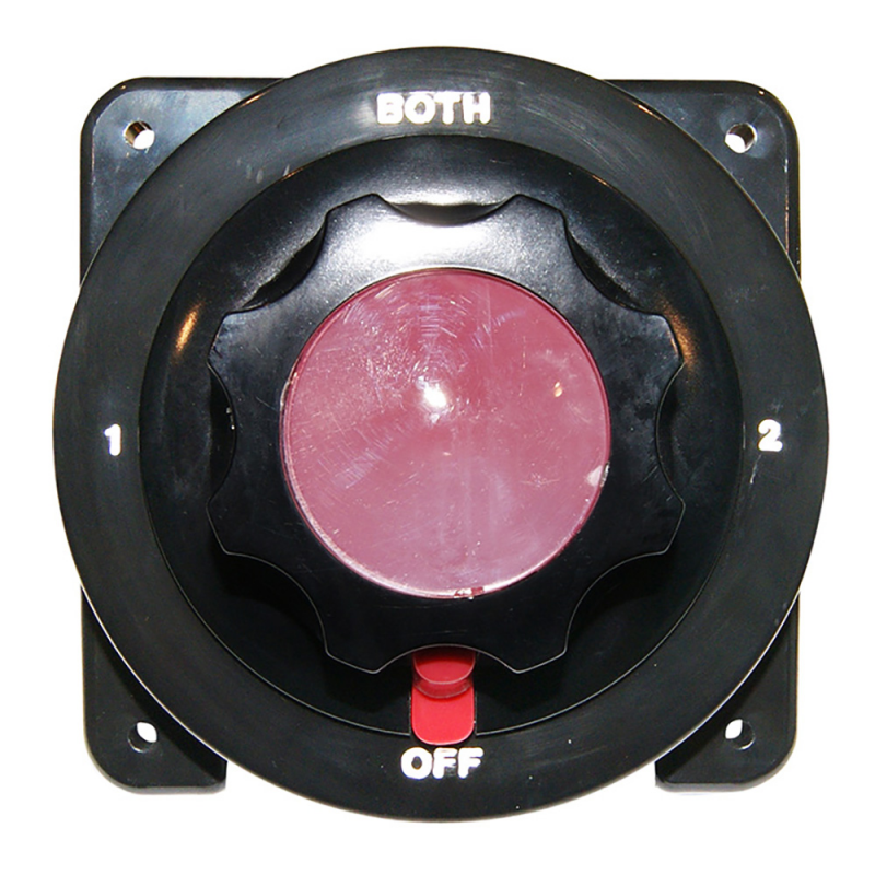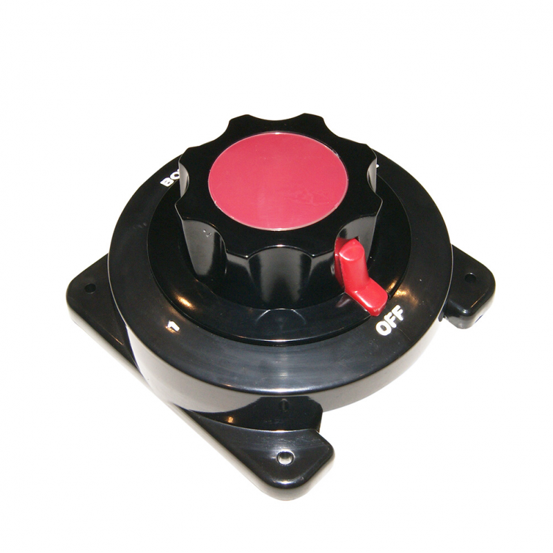 Deviatore staccabatteria per usare una o più batterie e staccare la corrente. Amp. 300/30’ intermittente. Amp. 175 in continuo. Terminali in ottone ø mm. 10. Dim. mm. 135 x 135 x 75 h. Posizioni di funzionamento: OFF-1-2-BOTH.