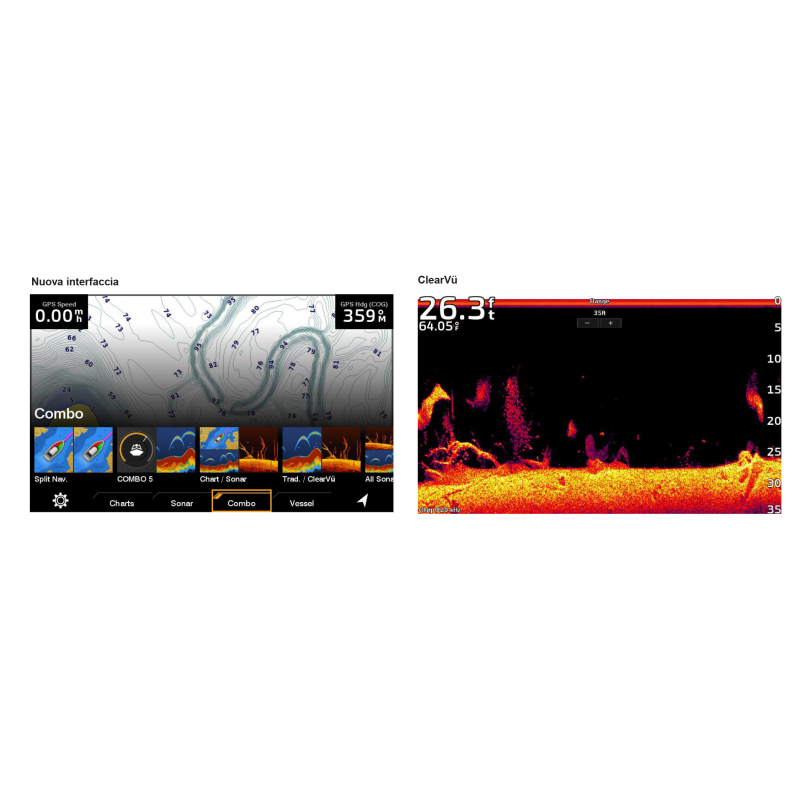 Ecoscandaglio: Tradizionale sulle freq. comprese tra 50 e 200khz e Ultra High-Definition, ClearVu.