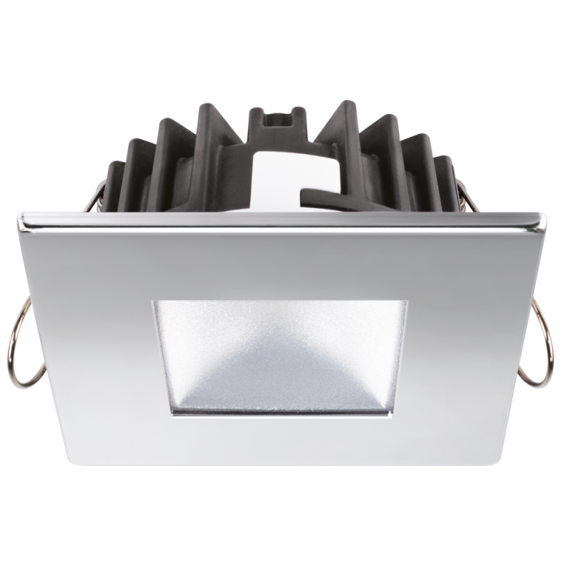 Faretto stagno IP 66, POWER LED ( 235 Lumen ) ad altissima luminosità, luce bianca calda con cornice quadrata in acciaio inox AISI 316 lucido. Sensibile alla polarità. Fissaggio con molle.