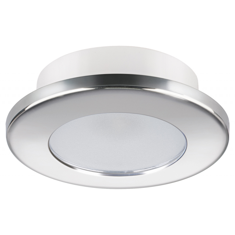 Faretto stagno IP66 ad 1 LED (100 Lumen) ad alta luminosità, luce bianca calda con cornice circolare in acciaio inox AISI 316 lucido. Sensibile alla polarità. Fissaggio con viti (non incluse)