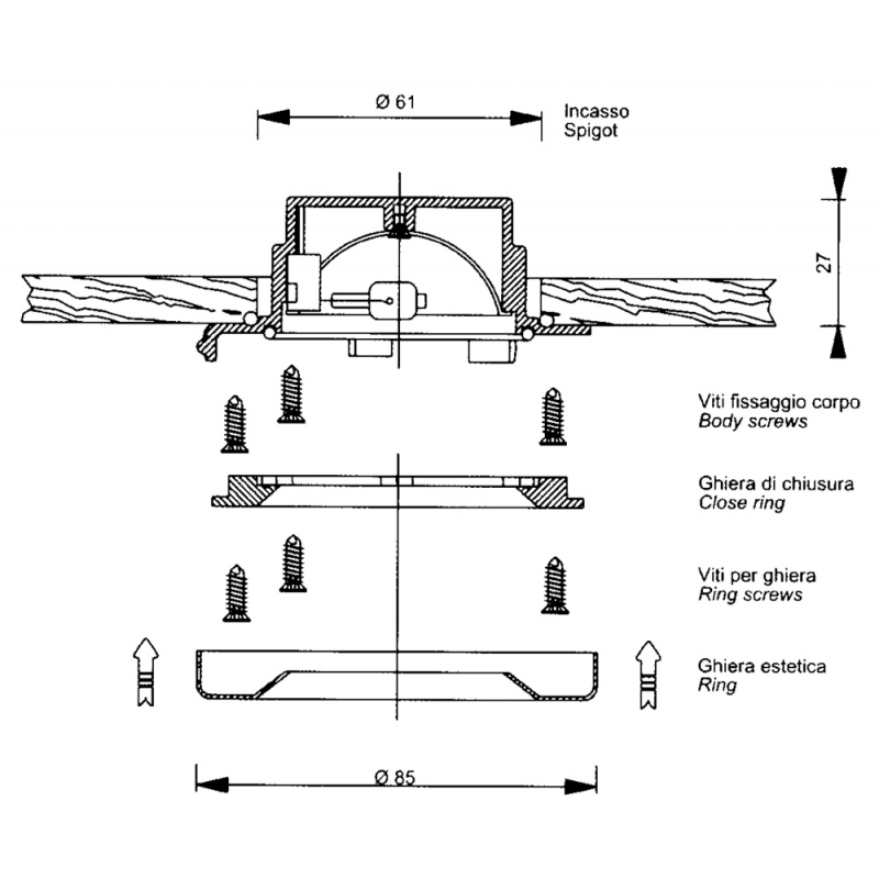 Faretto Acquarius stagno IP65 ad incasso, corpo in tecnopolimero, vetro temperato e satinato, ghiera esterna a vista in acciaio inox AISI 316. 3 fori di fissaggio. Lampadina (non compresa) per innesto G4 art: 4090318/320