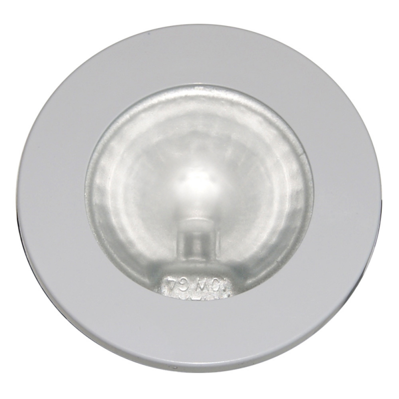 Faretto alogeno in materiale termoplastico ad incasso. Vetro di protezione sabbiato, completo di lampadina alogena 12V 10 W 3 fori di fissaggio.
