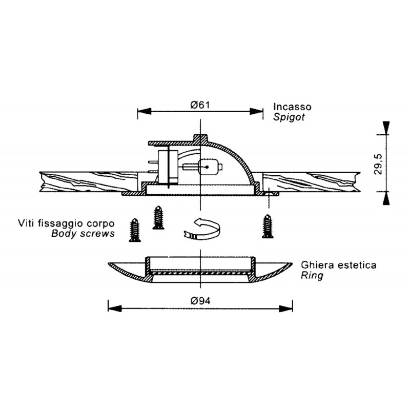 Faretti ad incasso in ottone pressofuso, con vetro temperato e satinato. 3 fori di fissaggio. Lampadina (non compresa) per innesto G4 art: 4090318