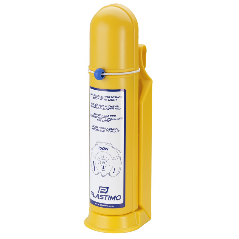 Salvagente gonfiabile a ferro di cavallo da lancio per il recupero di un uomo a mare, in nylon giallo spalmato poliuretano. Dotato di nastri riflettenti, di ancora galleggiante, fischietto e contenitore in ABS rigido fissato al supporto da un cordino.