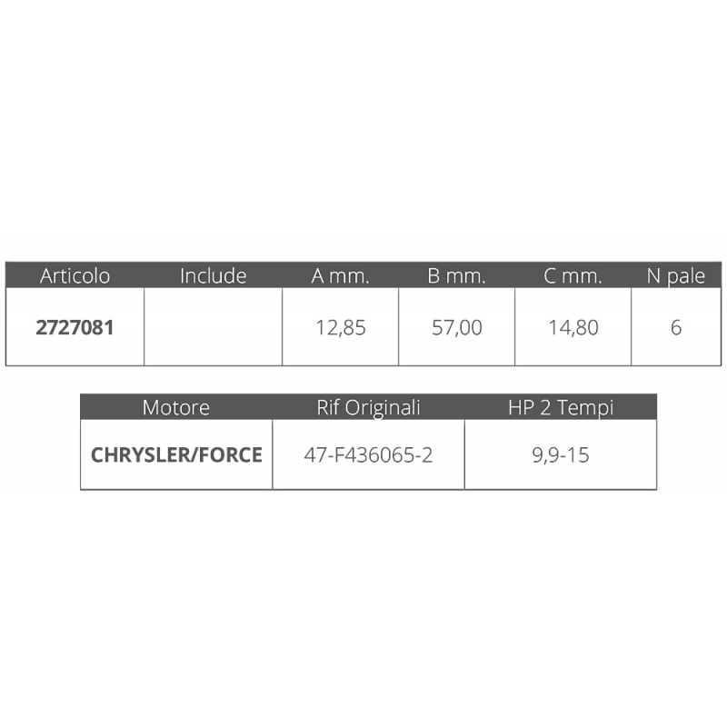 La girante FORCE 2T è progettata per motori da 9,9 a 15 HP, garantendo prestazioni ottimali e durata nel tempo. Grazie alla sua costruzione robusta e al numero di pale, questa girante assicura una spinta efficiente e costante, migliorando la navigazione.