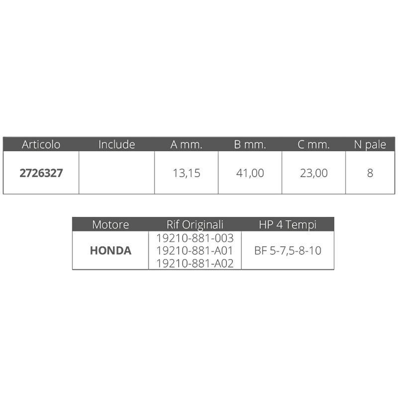 La girante Honda 4T è progettata per motori da 5, 7.5, 8, 10 HP, garantendo prestazioni ottimali e durata nel tempo. Questo componente è essenziale per il corretto funzionamento del motore, assicurando una spinta efficiente e costante. Grazie alla sua costruzione robusta e al numero di pale, questa girante offre una risposta immediata e affidabile in diverse condizioni di navigazione.