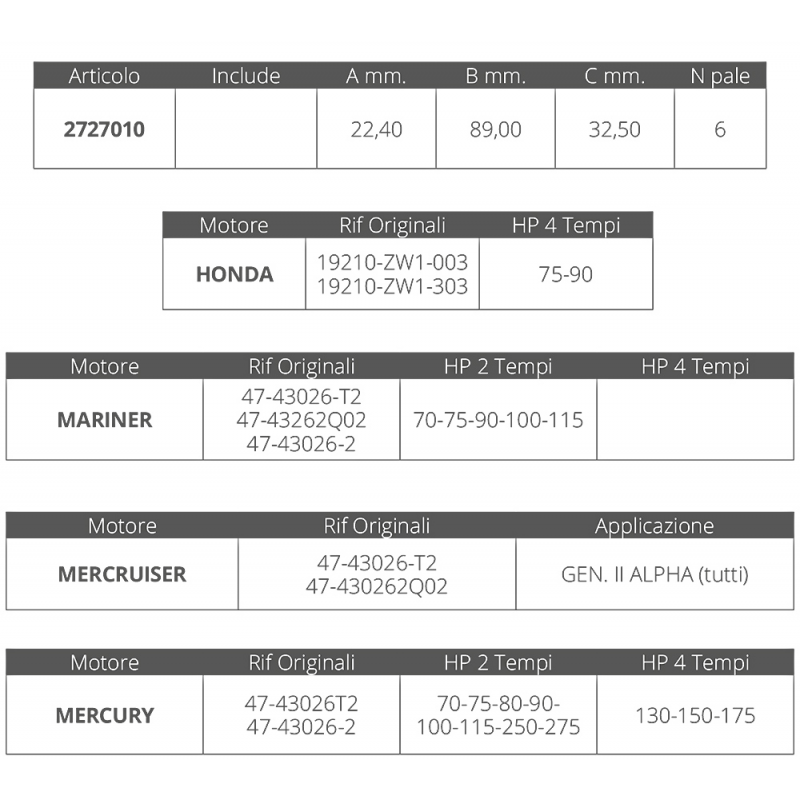 Compatibilità: Honda 4T 90 HP, Mariner/Mercury 2T 70-75-90-100-115 hp, Mercruiser generation ll alpha