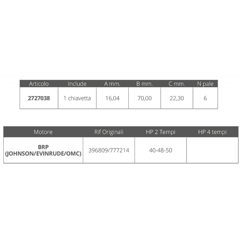 La girante per motori Johnson/Evinrude 2 tempi da 40-48-50 HP è un componente essenziale per il corretto funzionamento del sistema di raffreddamento del motore. Questa girante è progettata per garantire una circolazione ottimale dell’acqua all’interno del motore, prevenendo il surriscaldamento e assicurando prestazioni elevate e una lunga durata del motore stesso. La sua installazione è semplice e veloce, rendendola una scelta ideale per la manutenzione o la sostituzione.