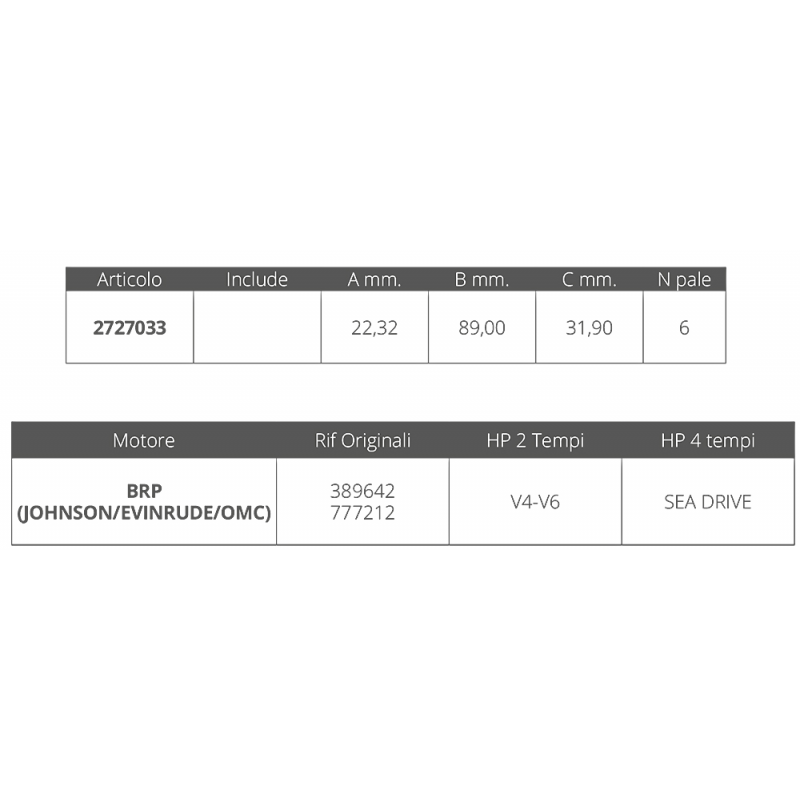 La girante per motori Johnson/Evinrude 2 tempi V4-V6 è un componente essenziale per il corretto funzionamento del sistema di raffreddamento del motore. Questa girante è progettata per garantire una circolazione ottimale dell’acqua all’interno del motore, prevenendo il surriscaldamento e assicurando prestazioni elevate e una lunga durata del motore stesso. La sua installazione è semplice e veloce, rendendola una scelta ideale per la manutenzione ordinaria o la sostituzione di giranti usurate.