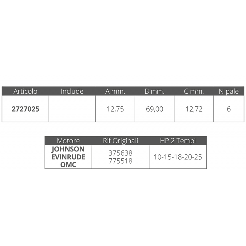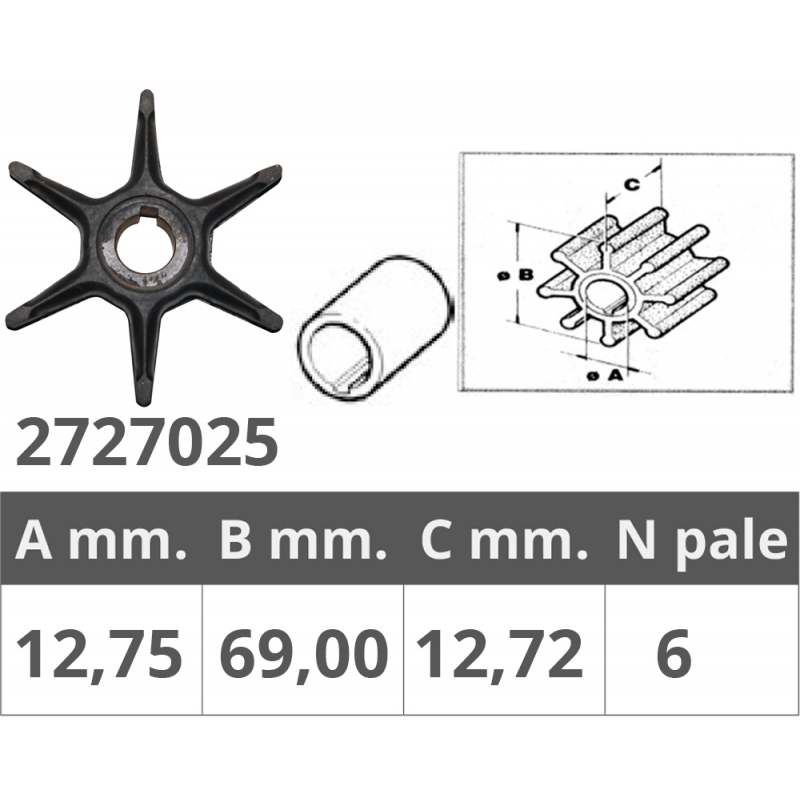 La girante per motori Johnson/Evinrude 2 tempi da 10 a 25 HP è un componente essenziale per il corretto funzionamento del sistema di raffreddamento del motore. Questa girante è progettata per garantire una circolazione ottimale dell’acqua all’interno del motore, prevenendo il surriscaldamento e assicurando prestazioni elevate e una lunga durata del motore. La girante è dotata di 6 pale che permettono un flusso d’acqua costante e efficiente.