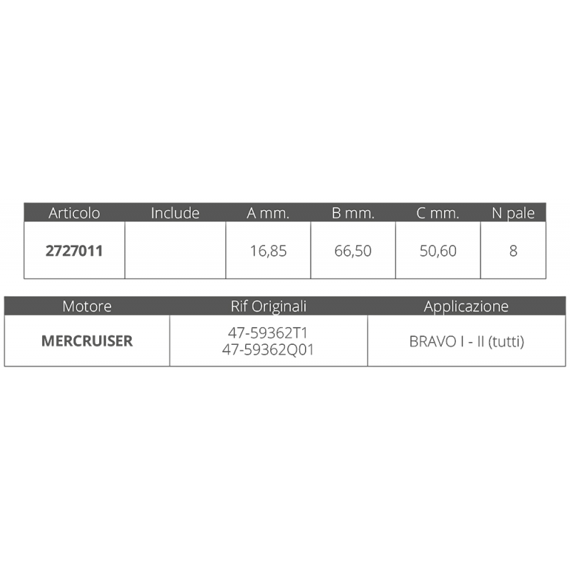 La girante per Mercruiser Bravo I-II è un componente essenziale per il corretto funzionamento del tuo motore. Questa girante è progettata per garantire una perfetta compatibilità e prestazioni ottimali. Grazie alla sua costruzione robusta e alle pale accuratamente progettate, assicura una lunga durata e un’affidabilità senza pari.