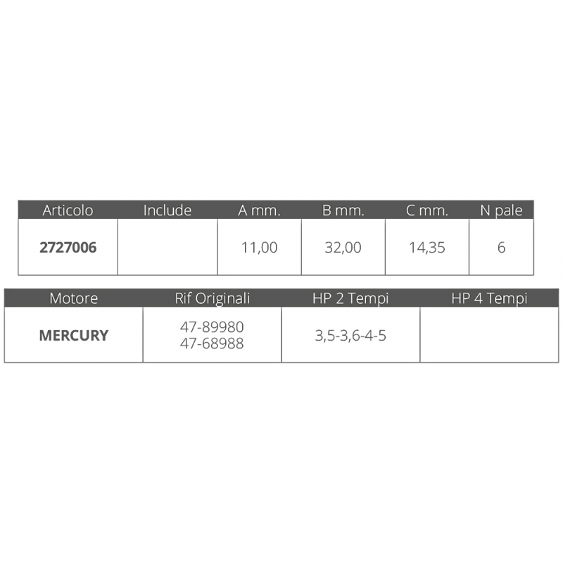 La girante Mercury per motori 2 tempi è compatibile con modelli da 3,5 a 5 HP. Questo componente essenziale per il funzionamento del motore è progettato per garantire efficienza e durata. La girante è dotata di 6 pale, assicurando così una spinta ottimale e una navigazione fluida.