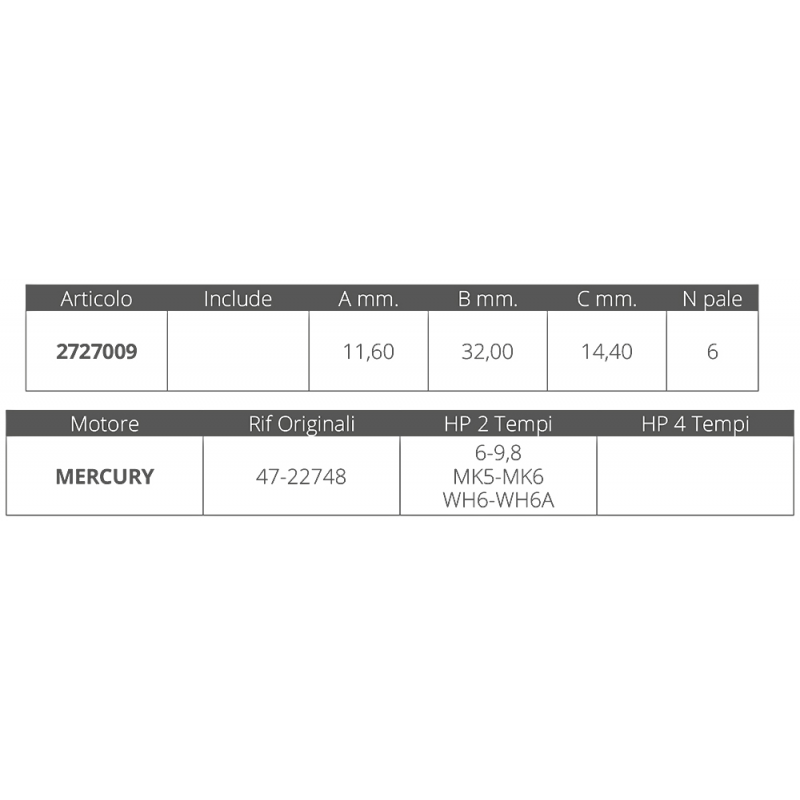 La girante Mercury 2T è progettata per motori da 6 a 9,8 HP, garantendo prestazioni ottimali e durata nel tempo. Questo componente è essenziale per il corretto funzionamento del motore, assicurando una spinta efficiente e costante. Grazie alla sua costruzione di alta qualità, la girante offre resistenza e affidabilità anche nelle condizioni di utilizzo più impegnative.