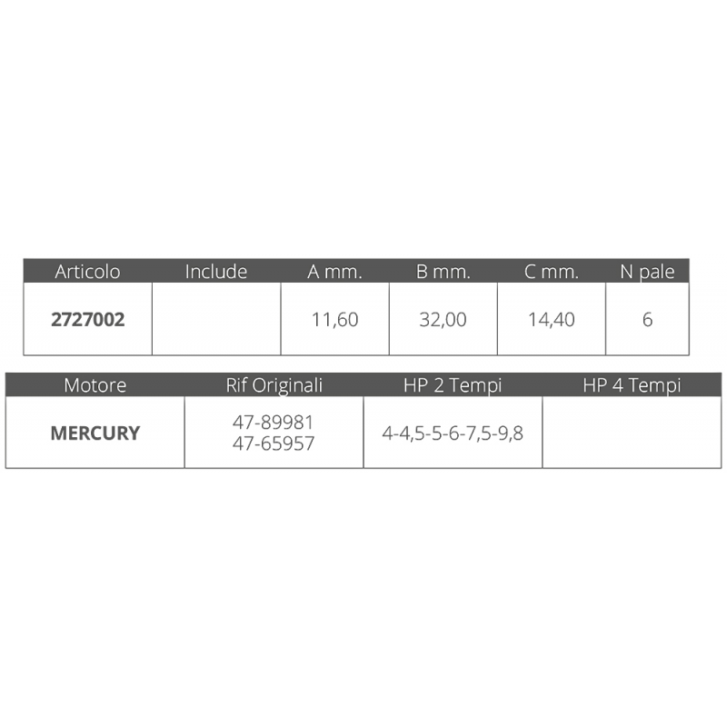 La girante Mercury 2T è progettata per motori da 4 a 9 HP, garantendo prestazioni ottimali e durata nel tempo. Grazie alla sua costruzione robusta e al numero di pale, questa girante assicura una spinta efficiente e costante, migliorando la navigazione.