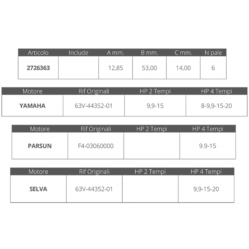 La girante per motori Selva/Yamaha è progettata per garantire prestazioni ottimali. Questo componente è essenziale per il corretto funzionamento del motore, assicurando una spinta efficiente e una navigazione fluida. La girante è compatibile con motori da 9,9 a 15 HP, rendendola una scelta versatile per diversi modelli di barche. Grazie alla sua costruzione di alta qualità, offre durata e resistenza nel tempo.