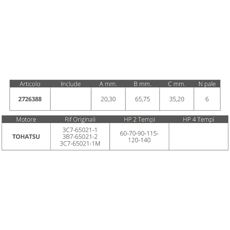 La girante per motori Tohatsu 2 tempi è compatibile con i modelli da 70, 90, 120 e 140 HP. Questo componente è essenziale per il corretto funzionamento del motore, garantendo un flusso d’acqua ottimale per il raffreddamento. La girante è dotata di 6 pale, progettata per offrire massima efficienza e durata.