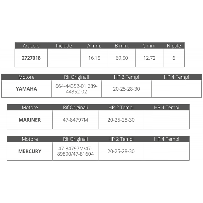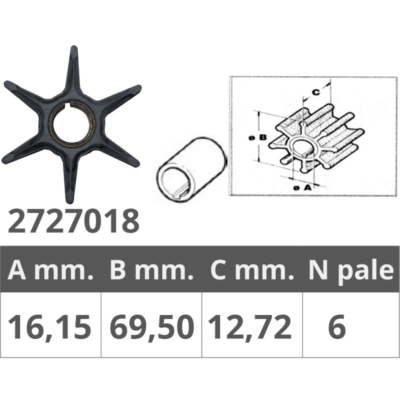La girante per motori Yamaha 2T da 25-30 HP è un componente essenziale per il corretto funzionamento del sistema di raffreddamento del motore. Questa girante è progettata per garantire una circolazione ottimale dell’acqua all’interno del motore, prevenendo il surriscaldamento e assicurando prestazioni elevate e una lunga durata del motore. La girante è dotata di 6 pale che permettono un flusso d’acqua costante e efficiente.