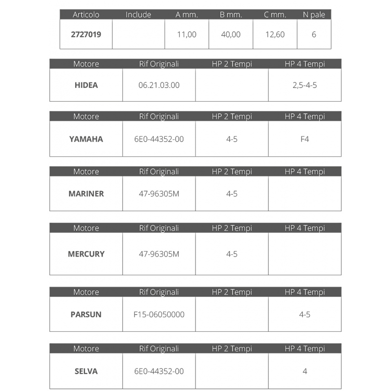 La girante è un componente essenziale per il funzionamento di motori marini, compatibile con i modelli Yamaha, Mariner e Selva. Questa girante è progettata per garantire un flusso d’acqua ottimale, contribuendo così alla corretta refrigerazione del motore. La sua durabilità e affidabilità la rendono una scelta ideale per la manutenzione o la sostituzione della girante esistente.