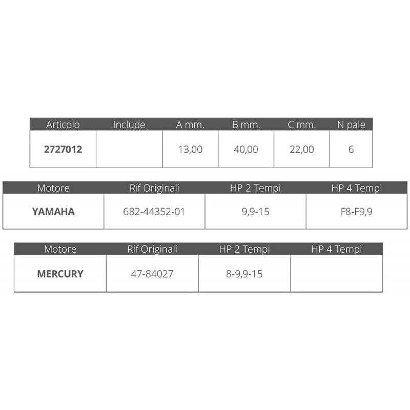 La girante per motori Yamaha-Mercury 2/4 tempi da 8-15 HP è un componente essenziale per il corretto funzionamento del sistema di raffreddamento del motore. Questa girante è progettata per garantire una circolazione ottimale dell’acqua all’interno del motore, prevenendo il surriscaldamento e assicurando prestazioni stabili e durature. La girante è dotata di 6 pale robuste che le conferiscono un’elevata efficienza e resistenza.