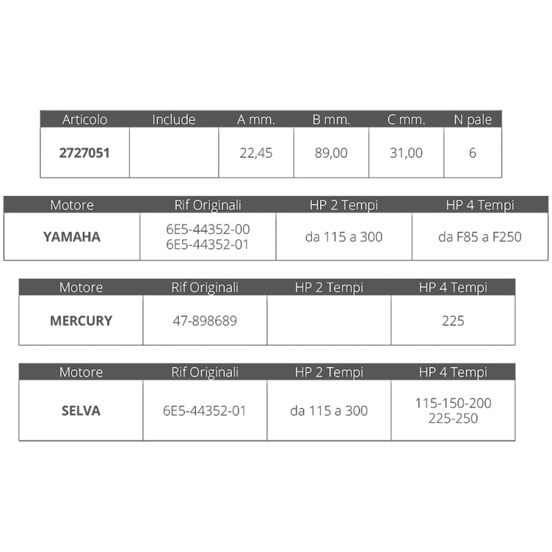 La girante per motori Yamaha/Mercury/Selva 2/4 tempi è un componente essenziale per il corretto funzionamento del sistema di raffreddamento del motore. Questa girante è progettata per garantire una circolazione ottimale dell’acqua all’interno del motore, prevenendo il surriscaldamento e assicurando prestazioni elevate e una lunga durata del motore. La sua installazione è semplice e veloce, rendendola una scelta ideale per la manutenzione ordinaria o la sostituzione di giranti usurate.