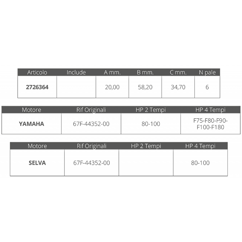 La girante per motori Yamaha/Selva 4T da 80-100 HP è un componente essenziale per il corretto funzionamento del sistema di raffreddamento del motore. Questa girante è progettata per garantire una circolazione ottimale dell’acqua all’interno del motore, prevenendo il surriscaldamento e assicurando prestazioni elevate e una lunga durata del motore. La girante è dotata di 6 pale robuste che garantiscono un flusso d’acqua costante e efficiente.