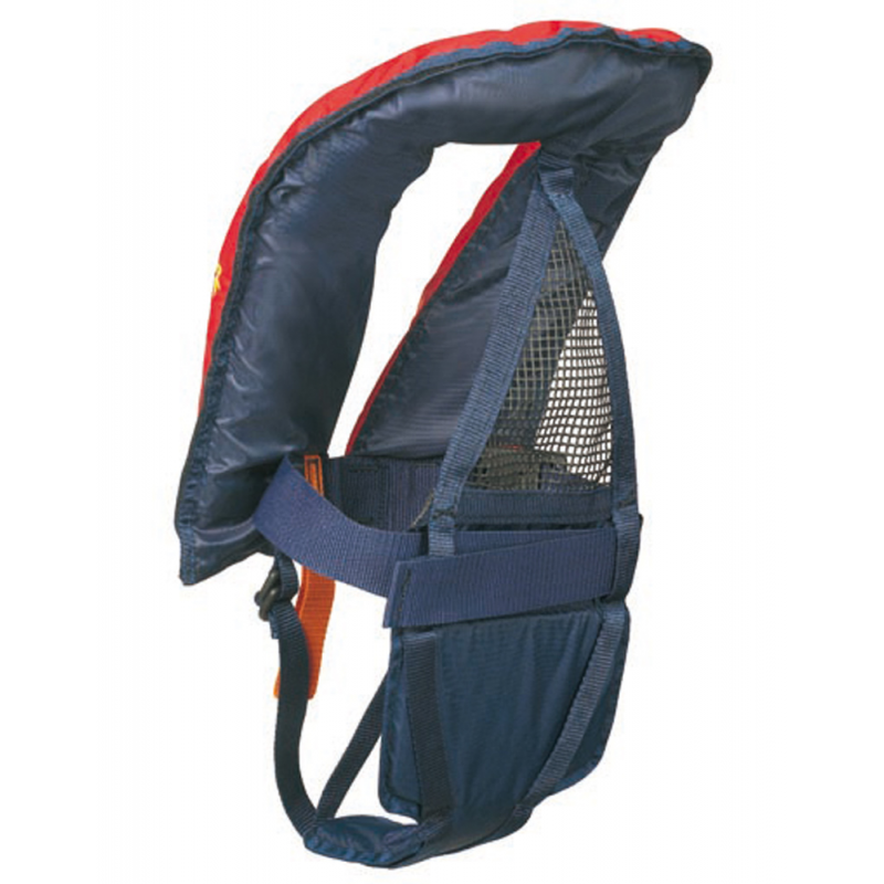Giubbotto di salvataggio gonfiabile automatico 150 N con custodia in tessuto blu tecnologico ad alta resistenza, senza imbrago. Dotato di nastro vita con fibbia a sgancio rapido in resina acetalica. Gli accessori di serie includono nastri retroriflettenti, fischietto, maniglia di sollevamento, nastro di recupero, schienalino, sottogamba imbottito e attacco per nastro di sicurezza. Certificato CE EN ISO 12402-3.