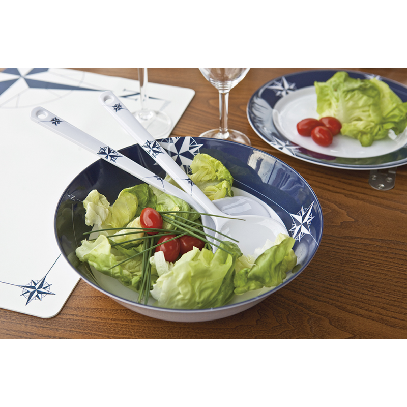 Servizio da tavola realizzato in melamina al 100%. Sui toni del blu navy e bianco. Lavabili in lavastoviglie. Le stoviglie, le tazze e i bicchieri hanno un anello antiscivolo alla base che ne impedisce lo scivolamento sul tavolo.