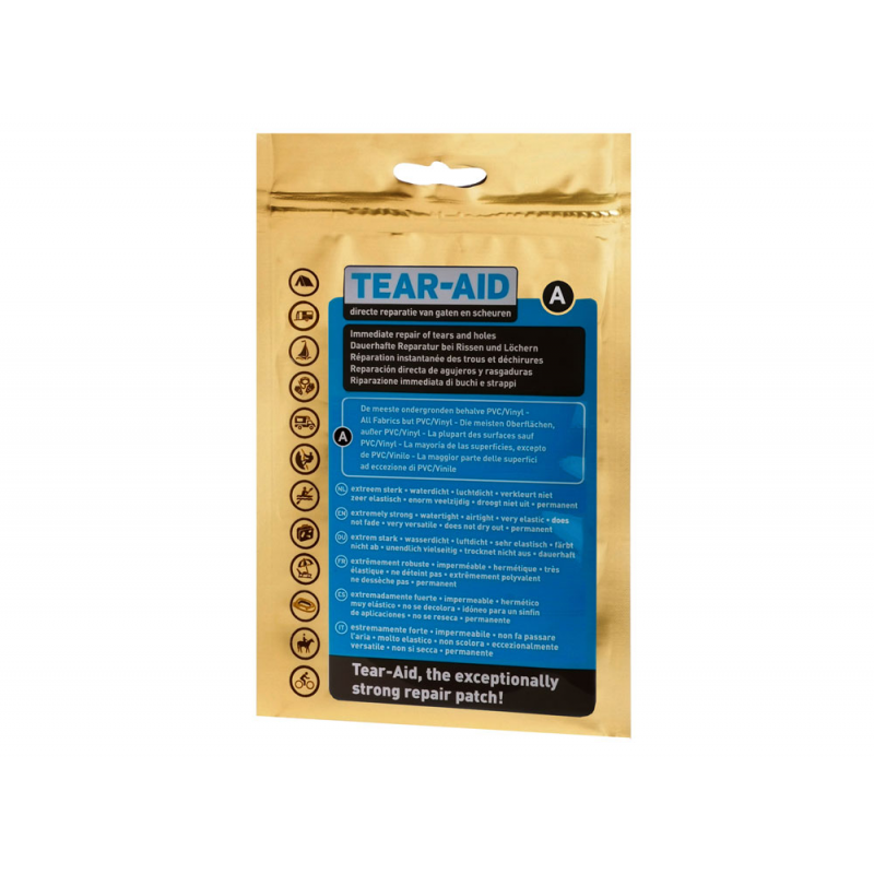 Pezza adesiva trasparente, elastica, forte, resistente alla perforazione, alla lacerazione, all’abrasione, per uso sia esterno che interno, per riparare tagli, strappi e buchi, idonea praticamente per tutti i materiali: Abbigliamento da sci, airtex, acrylate, aquiloni, banners, bimini tops, bladders, butyl, capottadell’auto, cordura, cotone, dacron, gommoni Zodiac, Gore-Tex, hydra-tex, Hypalon, Icarex,Impermeabili, abiti, gomma, materassini gonfiabili e giocattoli, mute, mylar, monofilm, neoprene,nylon, pelle lycra, plastica, vele, giocattoli, poliammide, poliestere, polietilene, poliuretano,ombrelli, sacchi a pelo, scuba, sedili, selle dei cavalli, tappeti, EPDM,PE,HDPE,LDPE,FPP,stivali, sunbrella, tavole da surf, tele, tende, tende in plastica PE, tubi, vetro, vetroresina, zaini