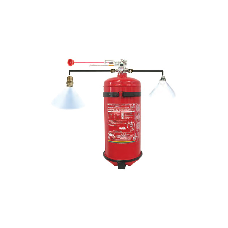 Estintore per barche con motore entrobordo, costituito da un serbatoio pressurizzato caricato con polvere ABC approvato R.I.Na ISO 9094. è un impianto automatico con comando manuale a distanza, termosensibile al calore ad apertura automatica a 93°. La valvola dispone di 2 uscite da 3/8” alle quali si collegano tubazioni di rame con un massimo complessivo di 4 ugelli che così erogano il getto estinguente con precisione nel punto effettivo del rischio di incendio. Montaggio senza necessità di filettare tubi, estremamente rapido e facile. L’impianto è fornito di: Serbatoio marcato CE PED 2014/68/EU - valvola automatica, 2 uscite da 3/8”, 5 mt di tubo di rame ø 10x1, ugelli speciali per polvere 3/8”, 1 cassetta con maniglia di comando a distanza, 1 cavetto di acciaio con guaina flessibile da 4 mt, 4 raccordi ad attacco rapido per tubo rame ø 10x1 - 1 staffa fissaggio. Satura m3. 10