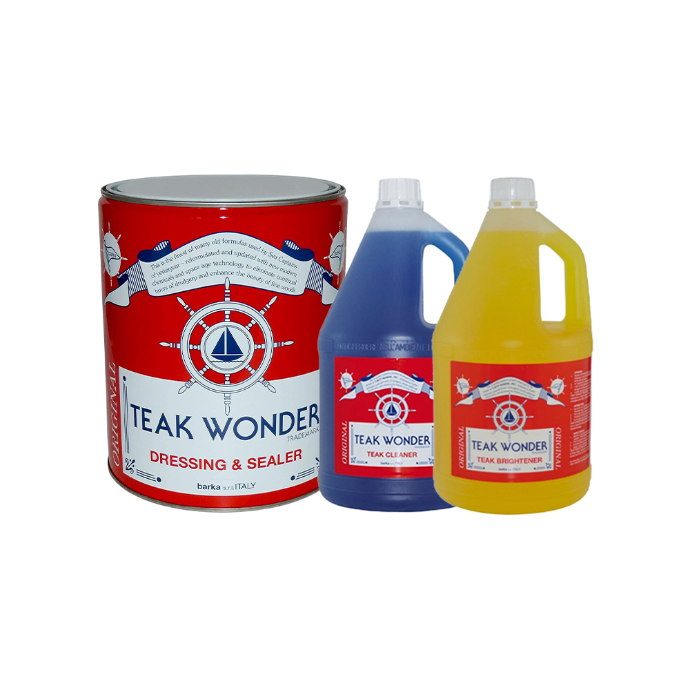 Il kit Teak Wonder comprende tre prodotti: Teak Wonder Dressing & Sealer, Teak Wonder Cleaner e Teak Wonder Brightener.