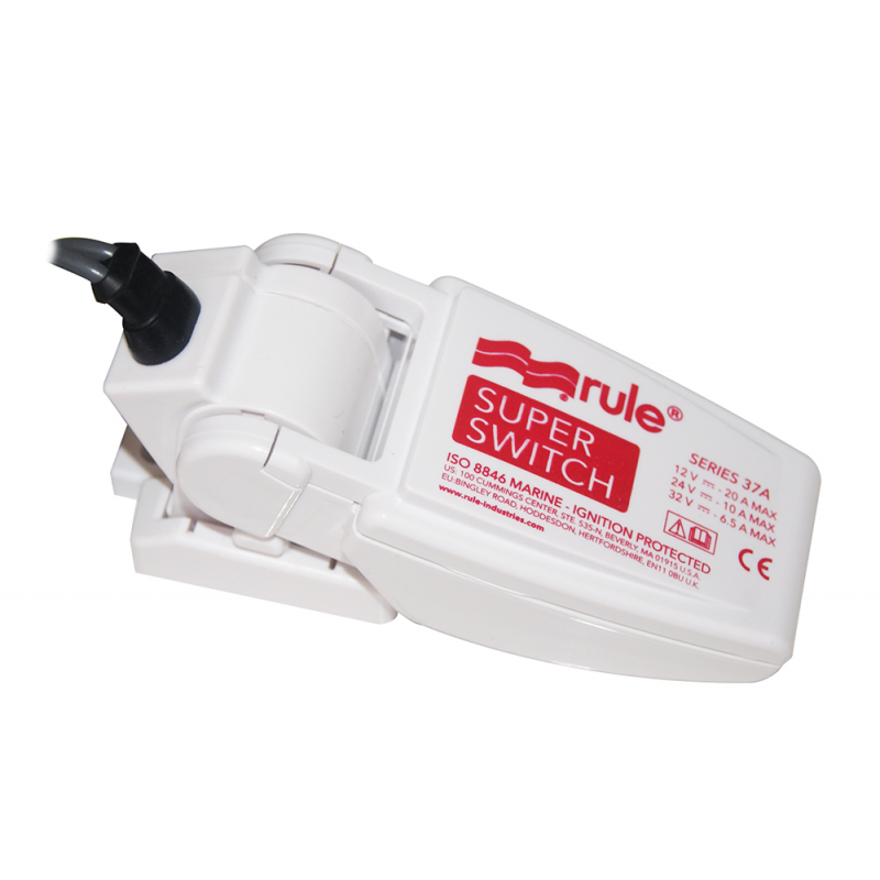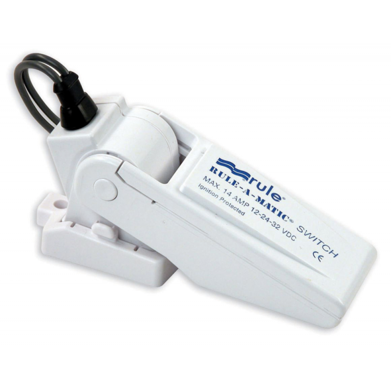 Interruttore galleggiante RULE senza mercurio per pompe di sentina. La basetta smontabile garantisce una facile installazione e manutenzione. 2 fori di fissaggio.