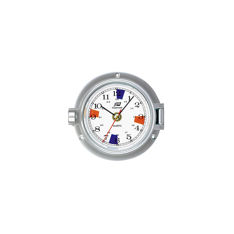 Orologio in alluminio cromato opaco con meccanismo al quarzo con zona silenzio radio, vetro minerale smussato.