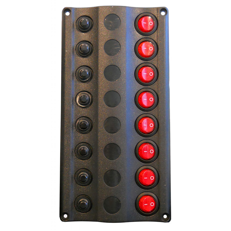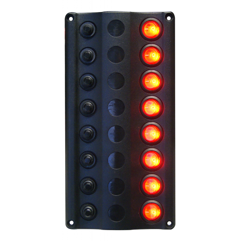 Pannello elettrico in plastica nera con interruttori basculanti ON-OFF, luce a LED per indicare la linea attiva e magnetotermici di protezione sovraccarico. Per impianti a 12 vdc.